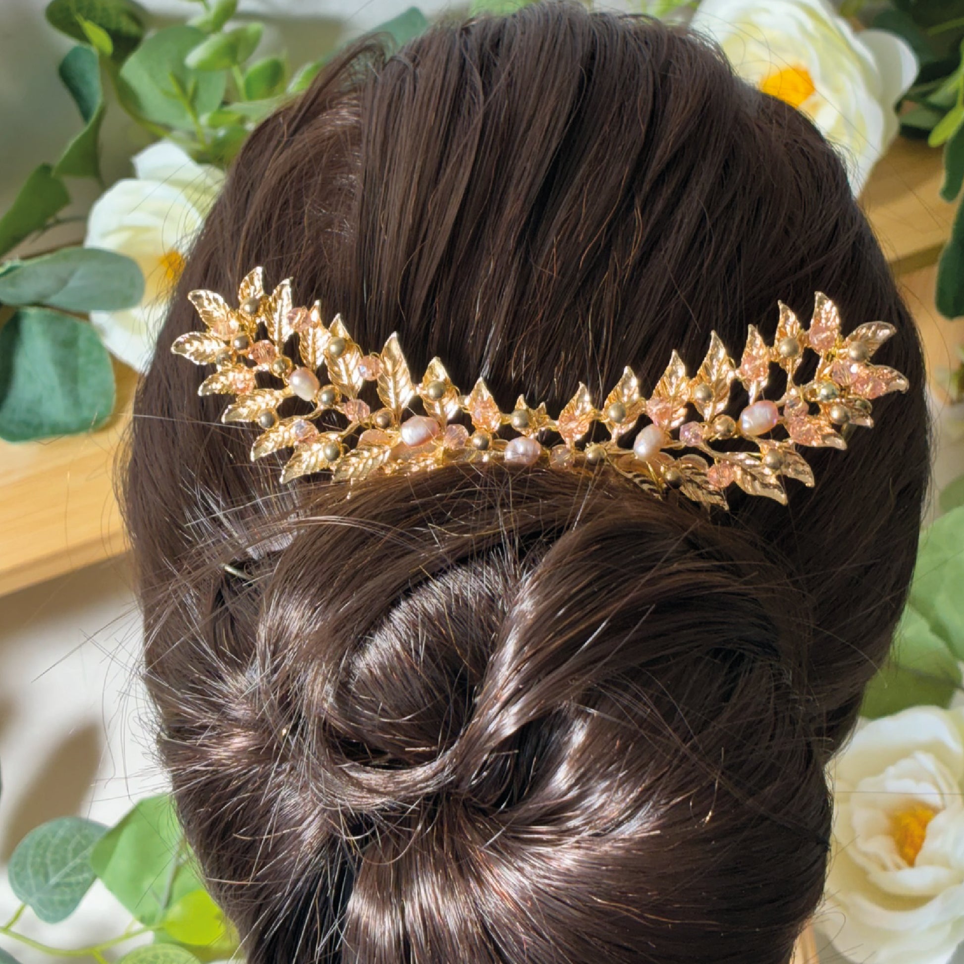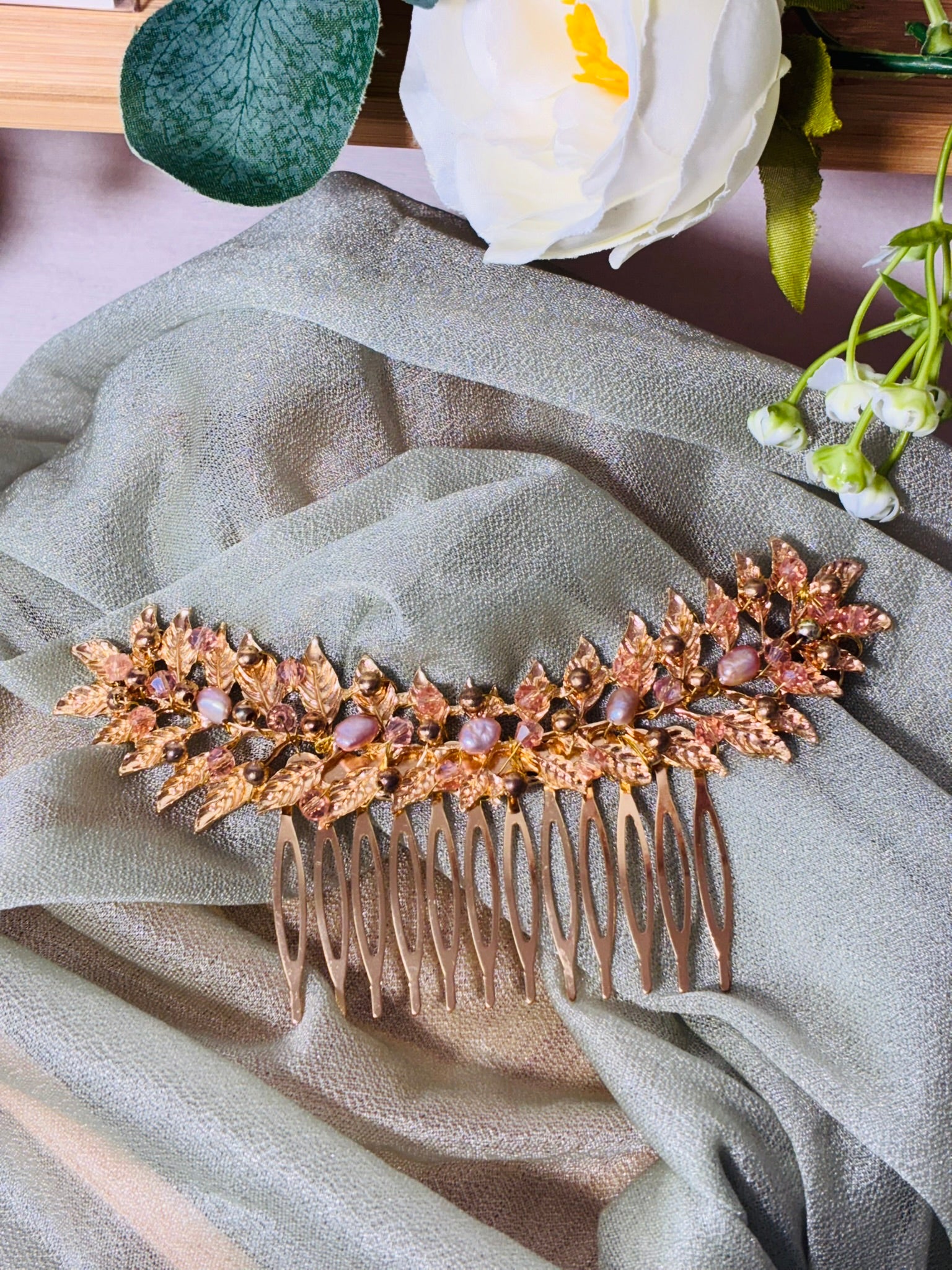 Peigne doré orné de feuille de laurier et de perle d'eau douce rose nacré.