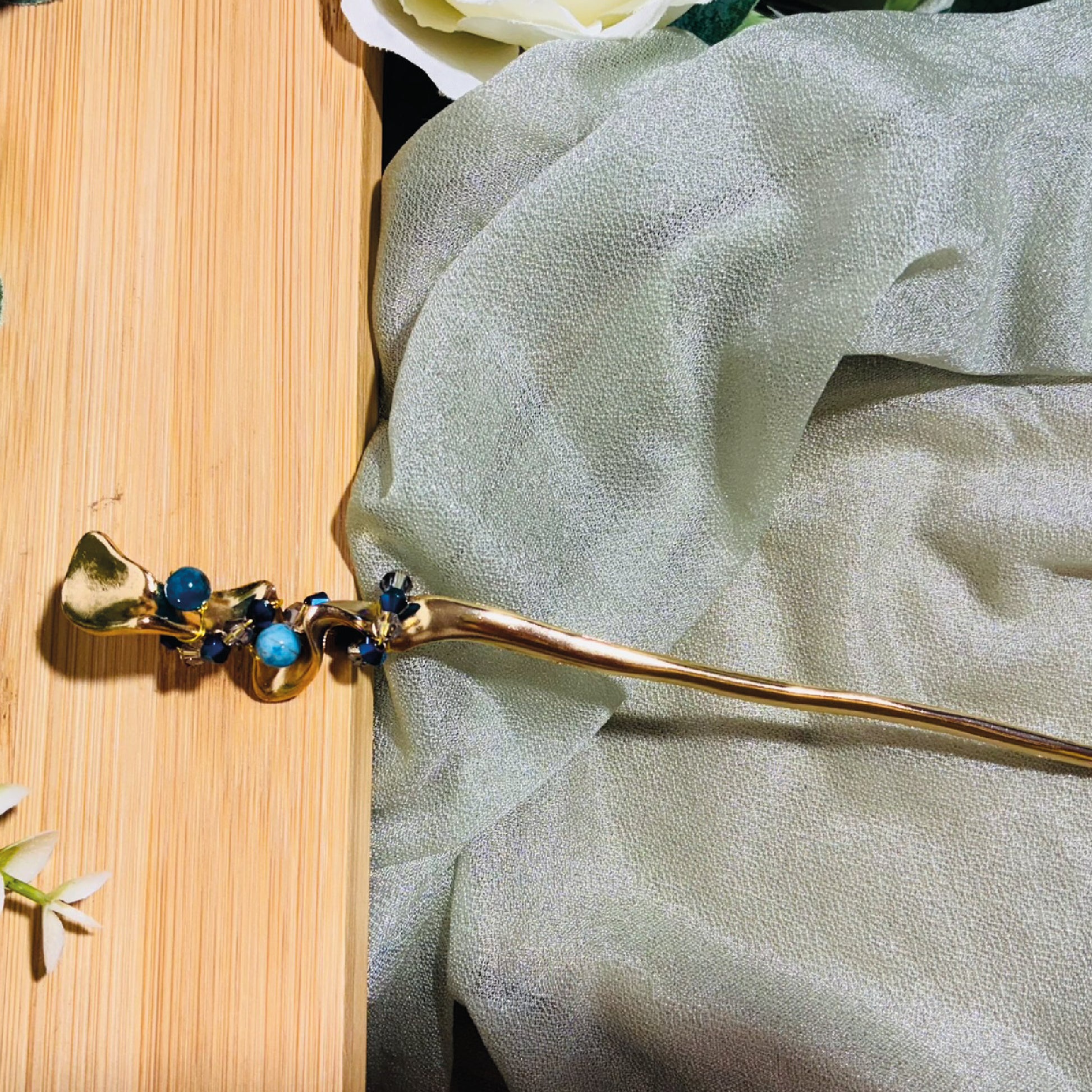 Pic à cheveux doré orné de pierres de pierres d'Apatite Bleue.