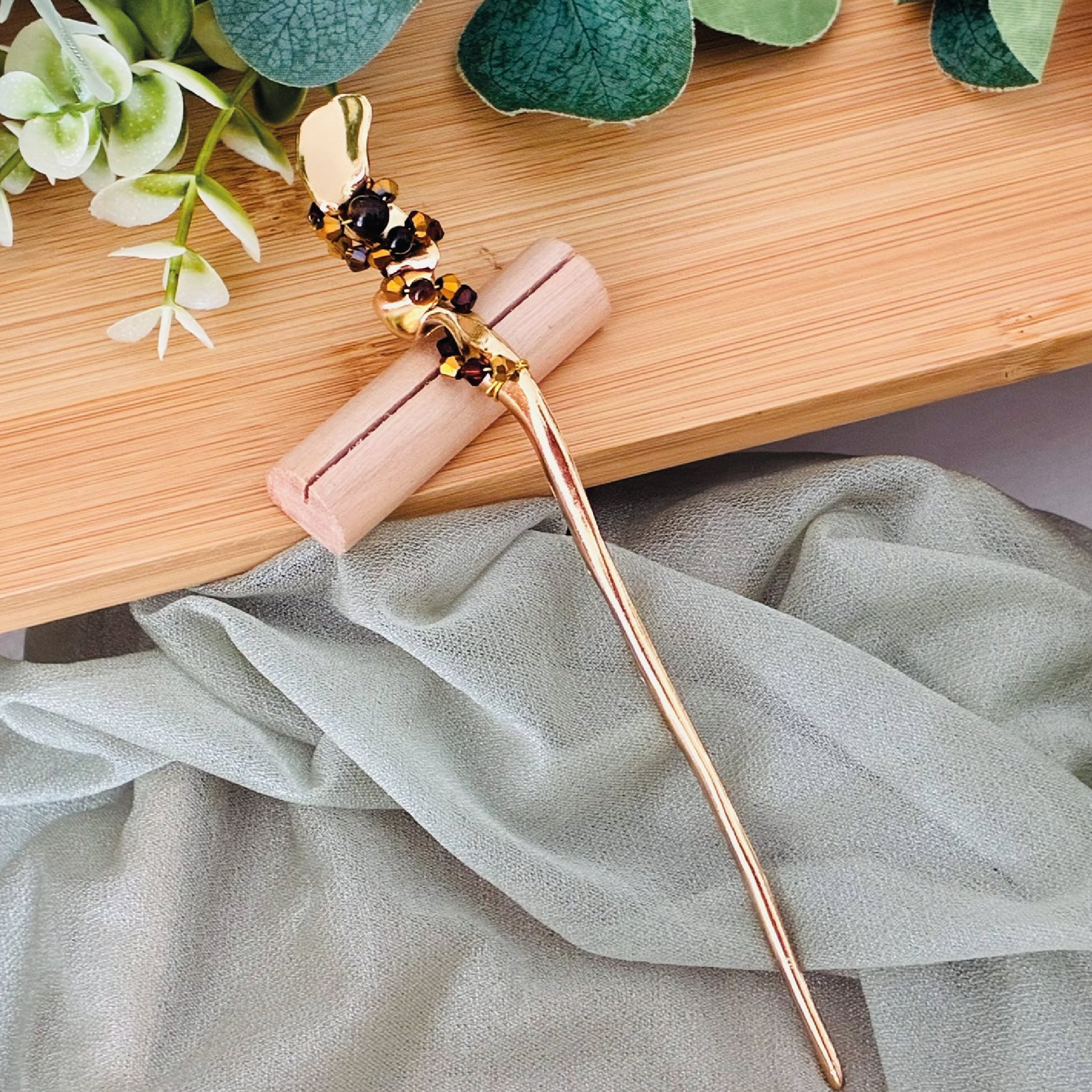 Pic à cheveux doré orné de pierres d' Œil de Tigre.